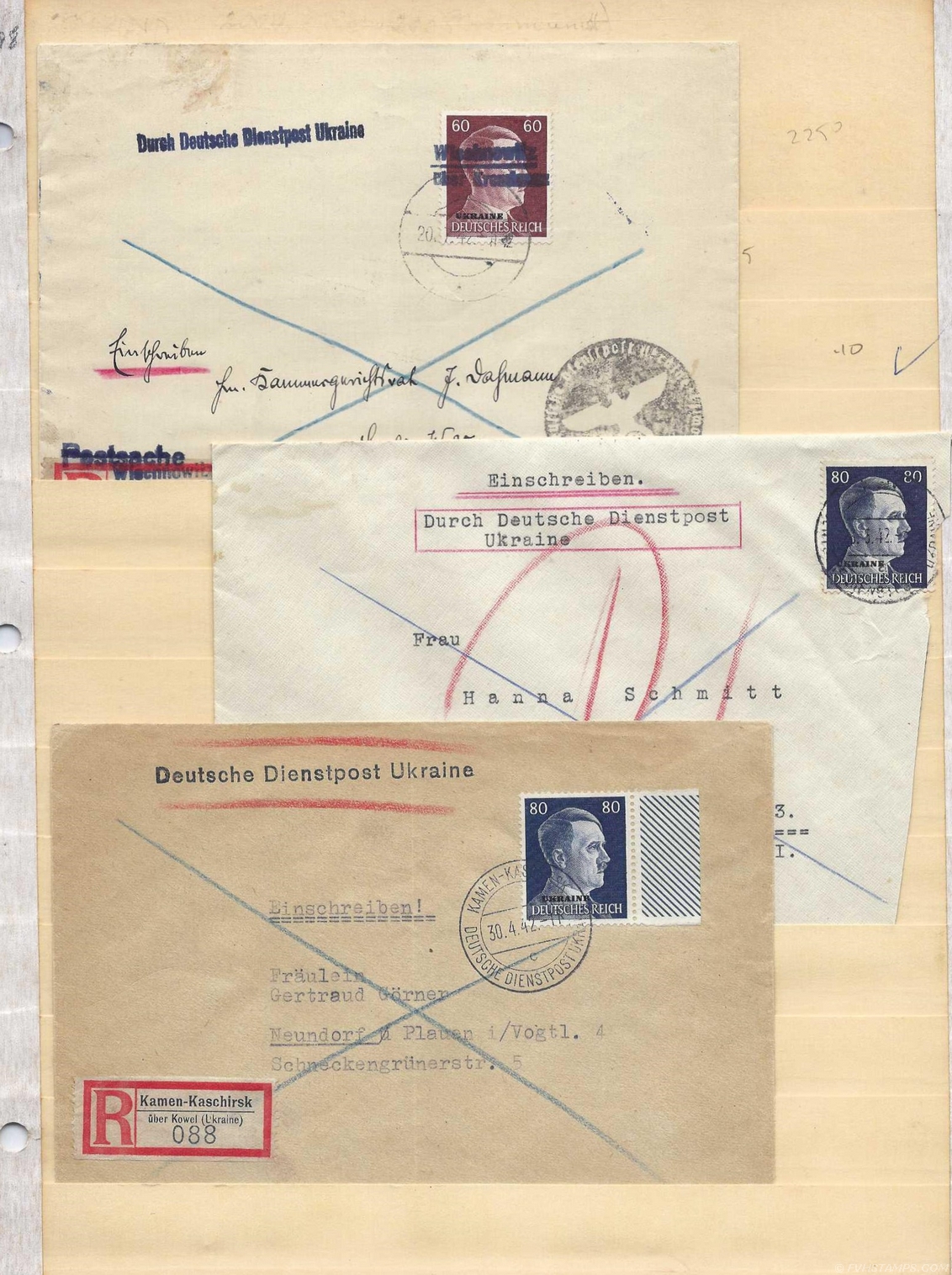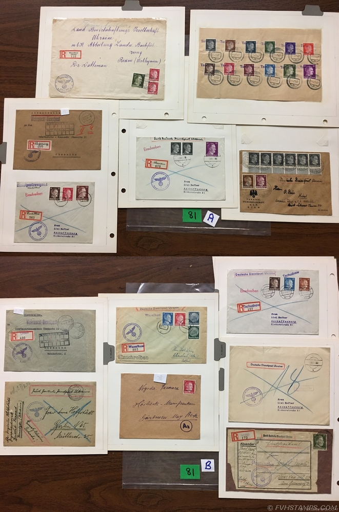 79. GERMANY: DEUTSCHE DIENSTPOST UKRAINE COVERS. ‘B’ to ‘D’ offices 1942-44. Group of 14 on pages. Incl: unusual 24 June 1944 to Brest-Litowsk registered; 25 May 1942 general commissar’s ISSAR’s office DNJEPROPERTROWSK to Rowing registered w Michel #8 Multi-Frank; etc. Scarce material, Not often seen. Practically none offered on ebay ! STATED CV IS IRRELEVANT ! |