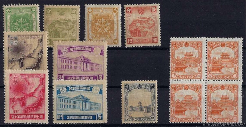 82. MANCHUKUO 1932-37. 19 used in sales cards. Incl: #10 rough perfs; #14, F; #31, F; #35, F; #61, F; #78, VF: #79-82, F; #104 perf faults; etc. |