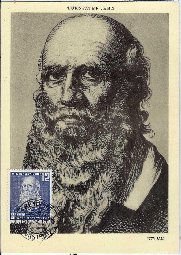 111. EAST GERMANY 1952 12 pf Jahn, Michel #J317, on Maxi-card w First Day cancel. |